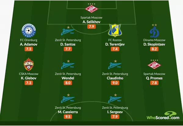 В ее состав вошли 5 игроков петербургского "Зенита" (нападающиt Матео Кассьерра и Иван Сергеев, полузащитники Вендел и Клаудиньо, защитник Дуглас Сантос), 2 футболиста московского "Спартака" (голкипер Александр Селихов и полузащитник Квинси Промес), а также защитник Дмитрий Скопинцев ("Динамо"), защитник Денис Терентьев ("Ростов"), полузащитник Кирилл Глебов (ЦСКА) и защитник Арсен Адамов ("Оренбург").