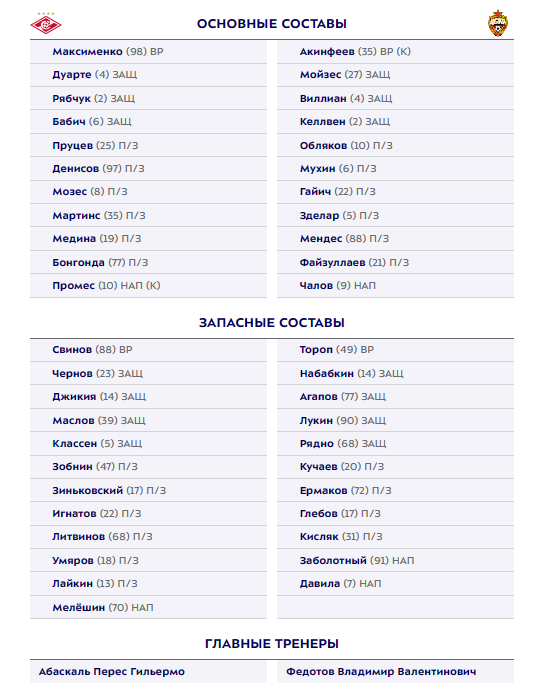 Официальный сайт Российской премьер-лиги опубликовал составы "Спартака" и ЦСКА на московское дерби в рамках 11 тура чемпионата России.