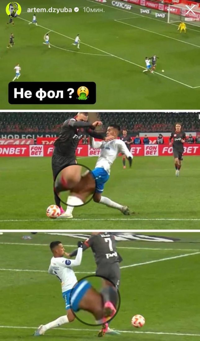 35-летний нападающий "железнодорожников" разместил в социальной сети скриншот эпизода своего столкновения в штрафной площади "Динамо" с 23-летним парагвайцем. Дзюба намекнул на возможное нарушение правил со стороны легионера "бело-голубых" и сопроводил запись подписью "Не фол?".