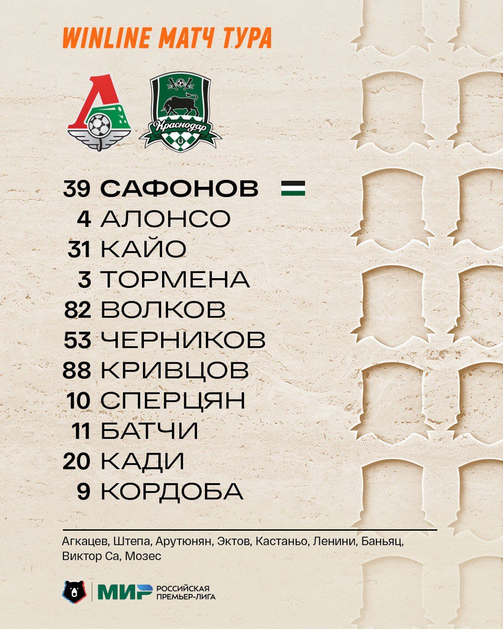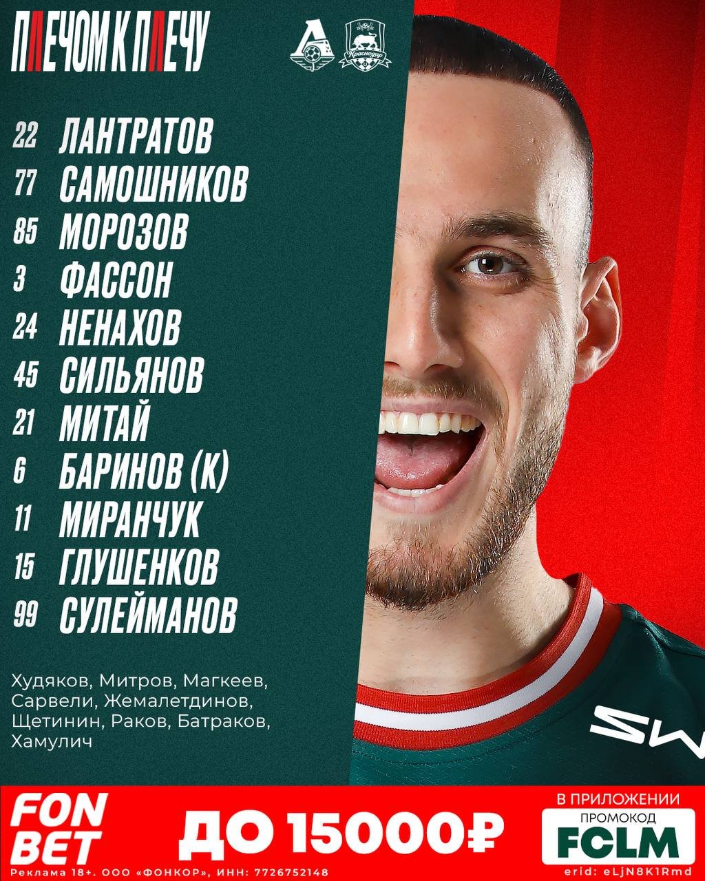 "Локомотив" - "Краснодар": стартовые составы команд на матч 22-го тура РПЛ