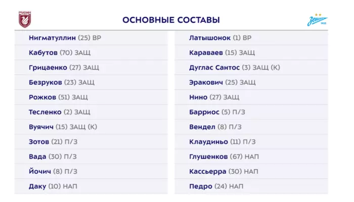 В основе "Зенита" на матч выйдет голкипер Евгений Латышонок, бразильский вингер Педро, а также его соотечественники Вендел и Клаудиньо, которых в последнее время связывали с возможным уходом из клуба. Новичок команды Максим Глушенков также появится в старте сине-бело-голубых.