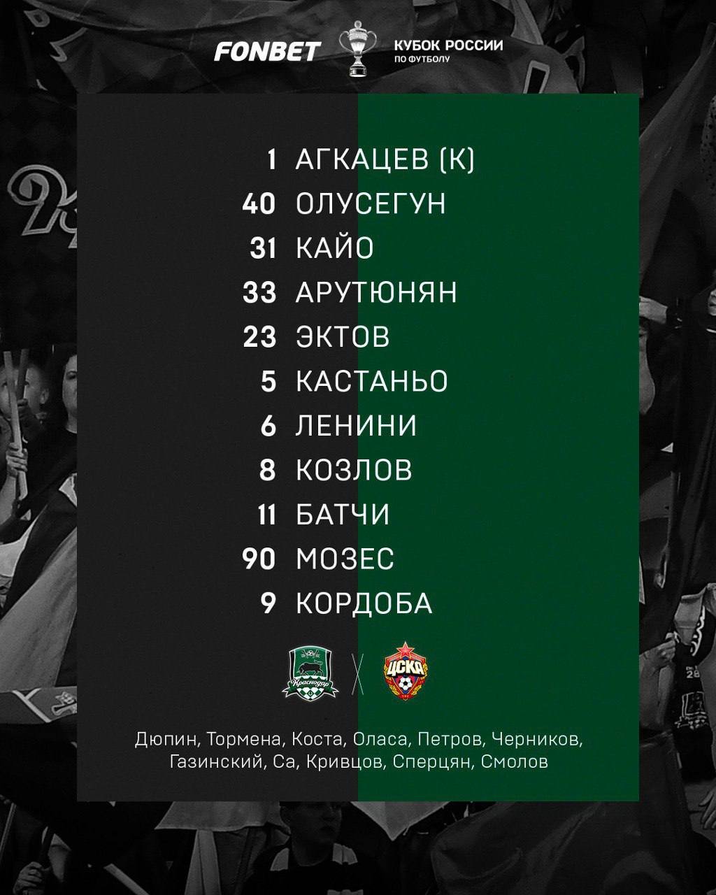 Стали известны стартовые составы "Краснодара" и ЦСКА на 1 тур Кубка России 31 июля 2024 20:22 "Краснодар" и московский ЦСКА объявили составы на матч 1-го тура группового этапа Пути РПЛ Кубка России. Матч пройдет на домашней арене "Краснодара" и начнется в 21:00 по московскому времени. Также в группе С сегодня сыграют "Пари НН" и "Ахмат". Подписывайтесь на новости футбола от Rusfootball.info в Telegram, Яндекс.Новостях и Гугл.Новостях. Все главные и интересные новости тут Гугл.Новости Яндекс.Новости Телеграм ЦСКА Краснодар