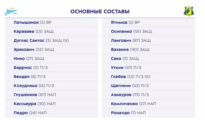 Бразильские полузащитники Вендел и Клаудиньо, которых связывают с возможным уходом из клуба, также выйдут на поле с первых минут. Место в воротах "Ростова" займет новобранец Рустам Ятимов. Справа в защите сыграет воспитанник "Зенита" Илья Вахания. Также в старте появится бразильский легионер Роналдо.