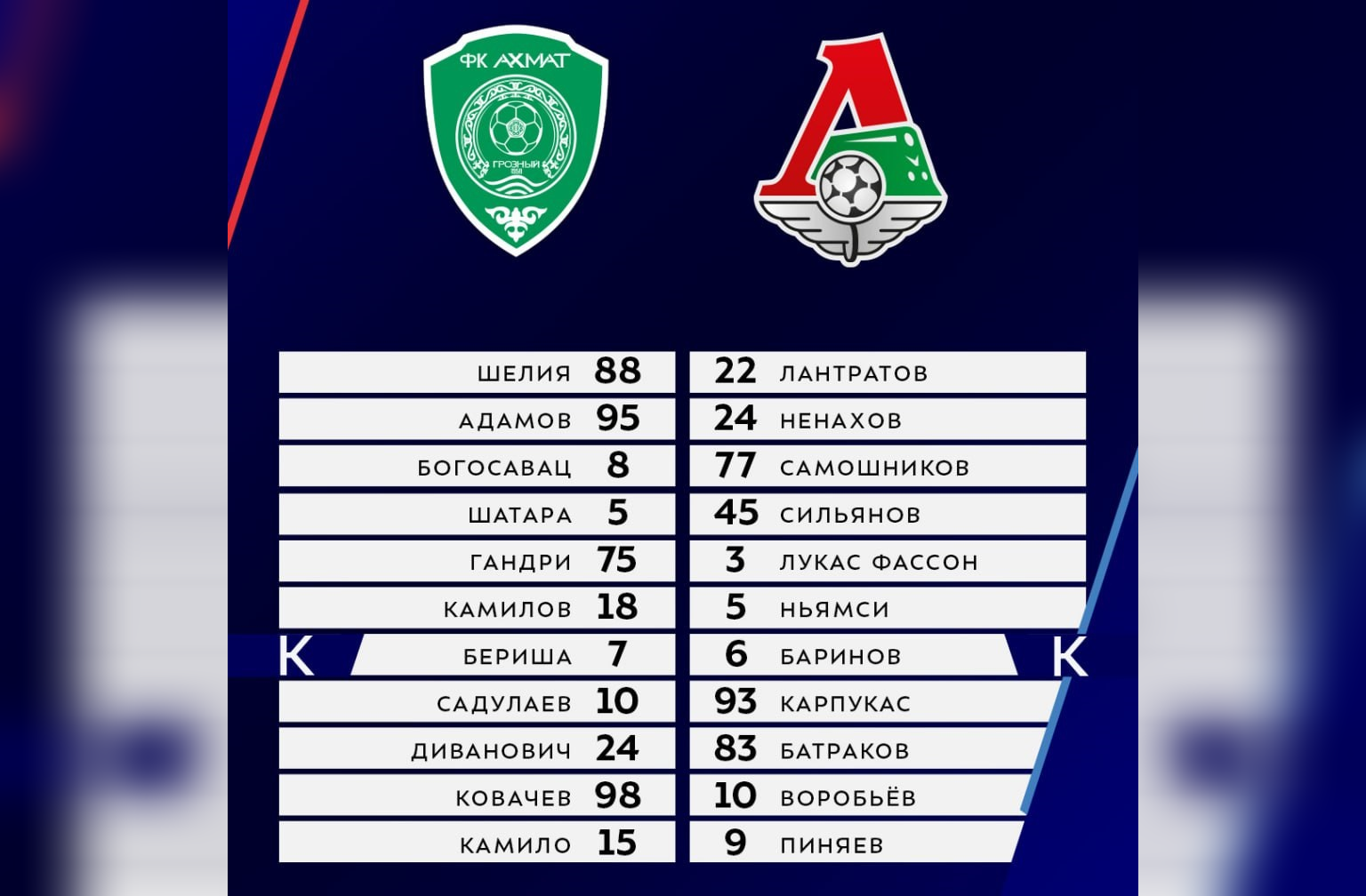 «Ахмат»: Шелия, Адамов, Богосавац, Шатара, Гандри (Силва, 77), Камилов (Тодорович, 46), Садулаев, Диванович (Швец, 62), Ковачев (Луна, 62), Камило, Бериша (Кардосо, 67)