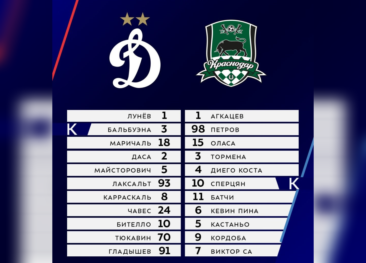 «Динамо» М: Лунёв (Лещук, 79), Бальбуэна, Бителло, Гладышев (Макаров, 74), Даса, Карраскаль (Боков, 90+2), Лаксальт, Майсторович, Маричаль (Скопинцев, 46), Тюкавин, Чавес (Гагнидзе, 85)