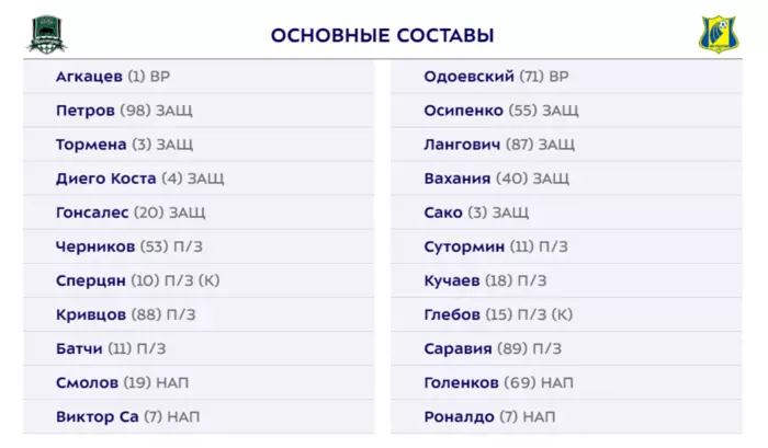 Место в воротах "Ростова" займет арендованный у "Зенита" голкипер Даниил Одоевский. Другой экс-игрок "Зенита" Алексей Сутормин также попал в число 11-ти игроков старта. В атаке "Ростова" на поле появятся форварды Егор Голенков и Роналдо. После 7-ми туров в активе "Краснодара" 15 очков. На счету "Ростова" - 11 очков.