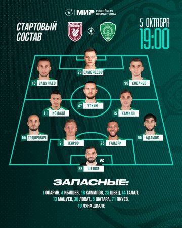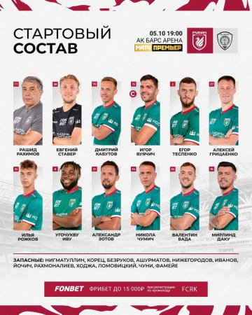 "Рубин" и "Ахмат" объявили стартовые составы на матч 11-го тура чемпионата России.