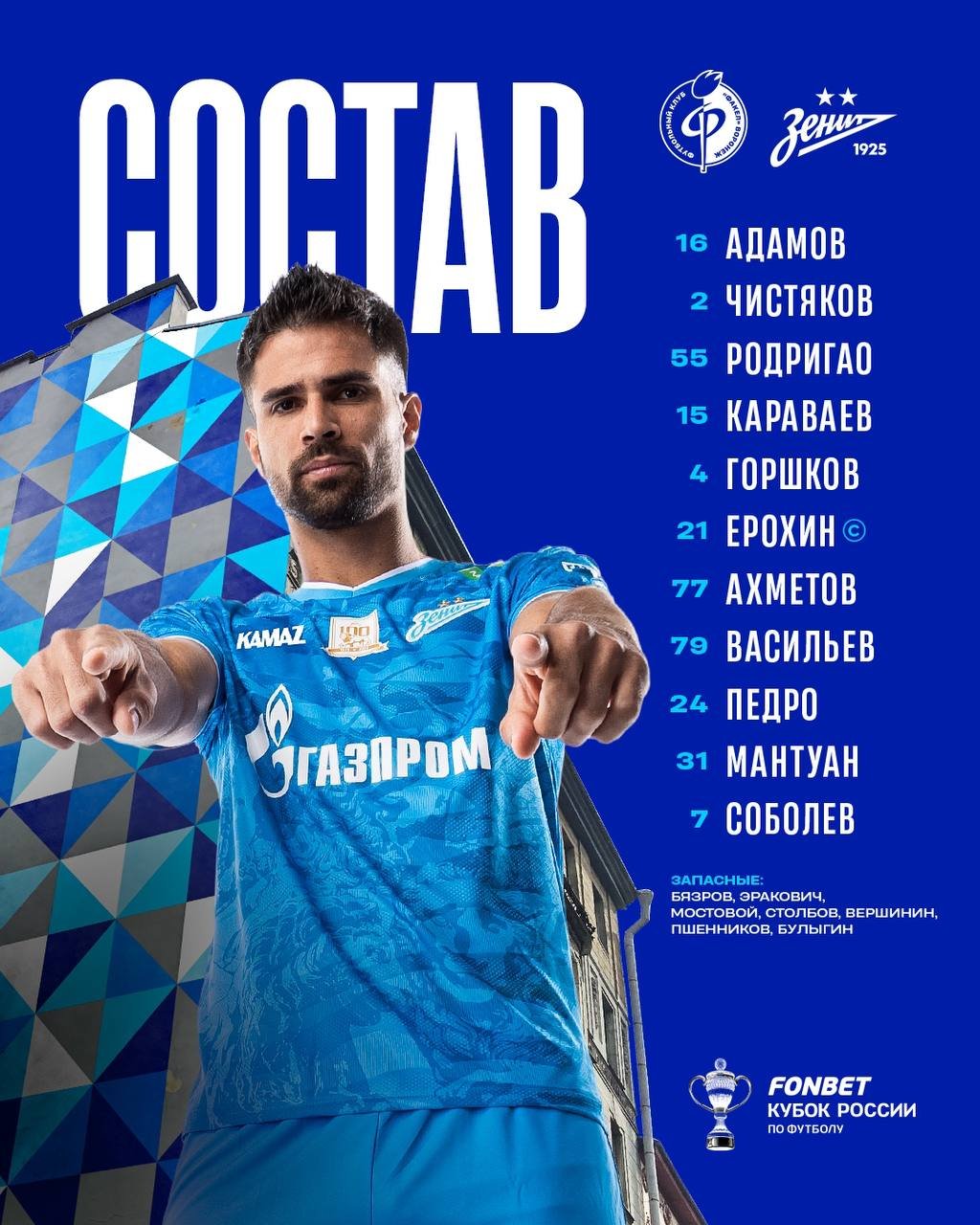 "Зенит" и "Факел" объявили стартовые составы на матч Кубка России: Соболев выйдет с первых минут 22 октября 2024 15:20 Петербургский "Зенит" и воронежский "Факел" объявили стартовые составы на матч 6-го тура группового этапа Пути РПЛ Кубка России. Фото: ФК "Зенит" Состав "Факела":Состав "Зенита":Матч "Факела" и "Зенита" пройдет в Воронеже, стартовый свисток прозвучит в 16:15 по московскому времени. Подписывайтесь на новости футбола от Rusfootball.info в Telegram, Яндекс.Новостях и Гугл.Новостях. Все главные и интересные новости тут Гугл.Новости Яндекс.Новости Телеграм Зенит Факел