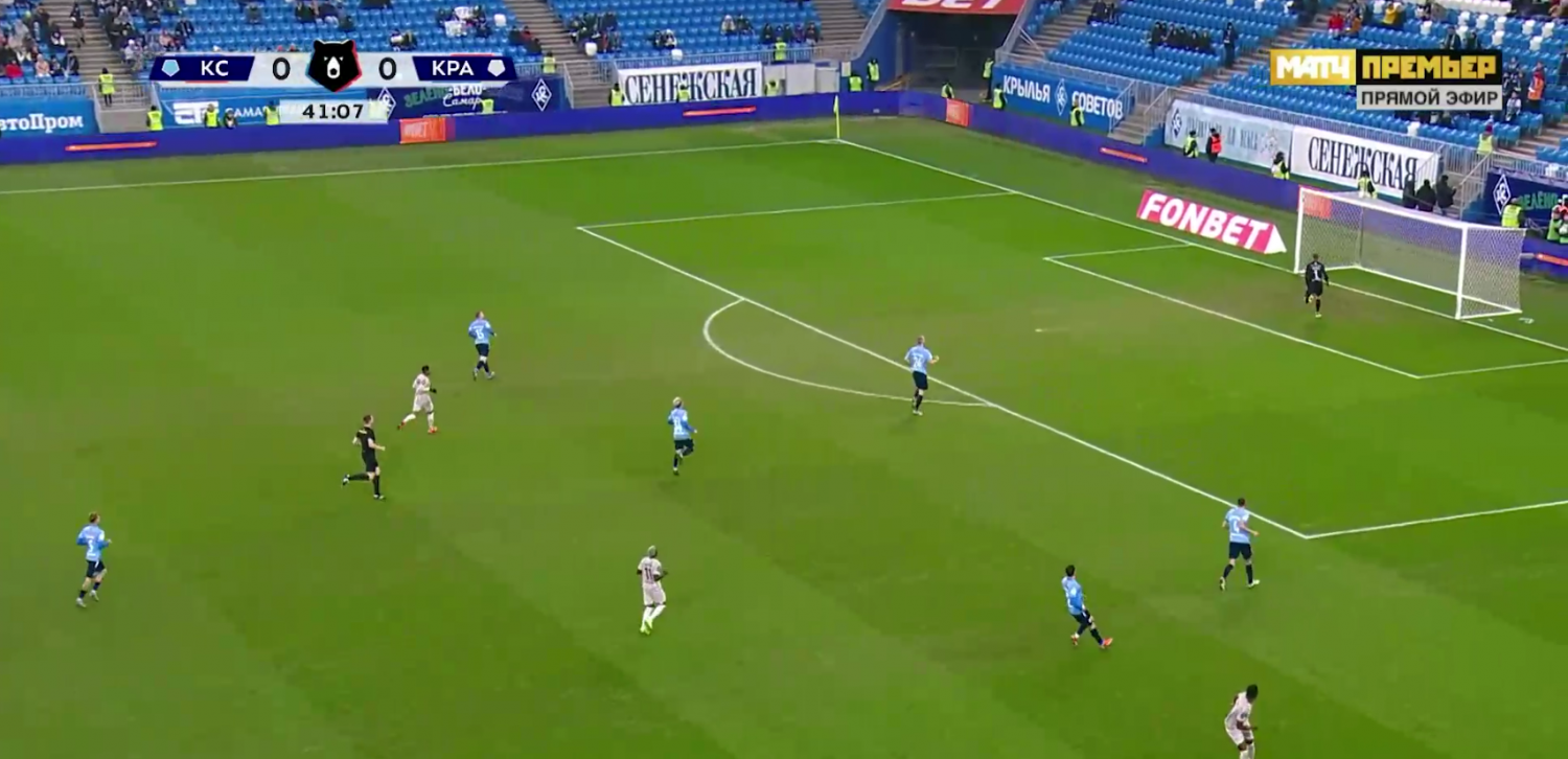 Голкипер "Крыльев Советов" Иван Ломаев отдал длинную передачу, которую перехватили игроки "Краснодара". Южане перевели мяч на правый фланг, а нападающий Джон Кордоба отправил мяч в сетку дальним ударом из-за пределов штрафной.