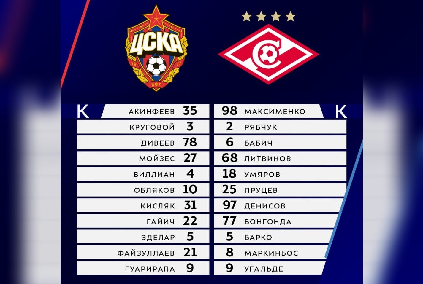 ЦСКА: Акинфеев, Мойзес, Круговой, Дивеев, Роша, Гаич (Пьянич, 63), Обляков, Кисляк (Келлвен, 63), Зделар (Глебов, 81), Файзуллаев (Мусаев, 63), Гуарирапа (Койта, 81)