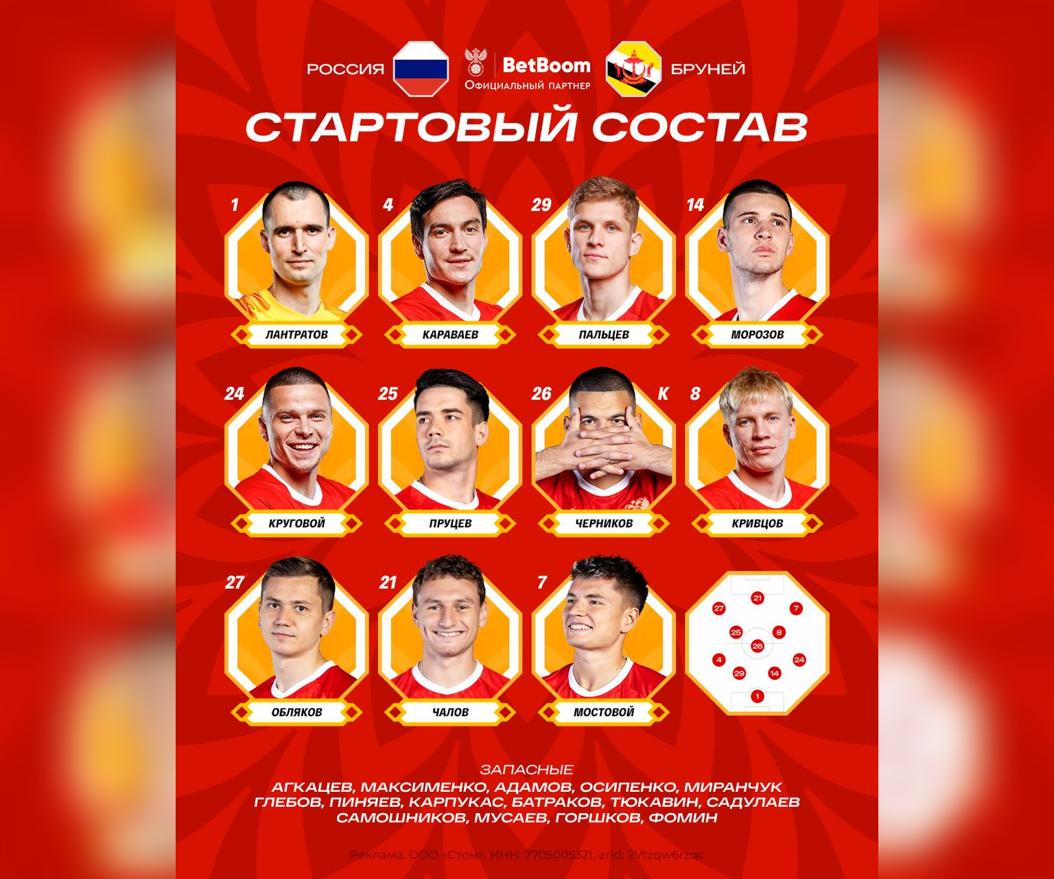 Россия: Лантратов (Агкацев, 46), Караваев, Пальцев, Морозов (Мусаев, 60), Круговой, Пруцев (Батраков, 77), Черников, Кривцов (Адамов, 60), Обляков (Садулаев, 46), Мостовой, Чалов (Карпукас, 60)