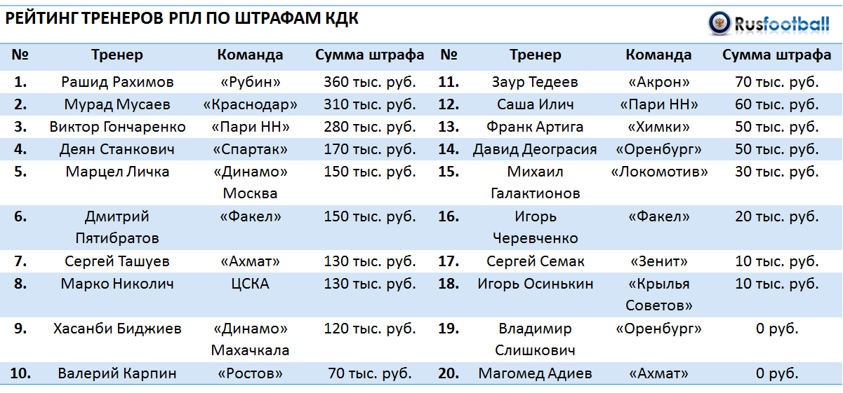 Больше всего раскошелиться в первой части сезона пришлось Рашиду Рахимову (360 тыс. руб.). Наставник казанского «Рубина» является настоящим рецидивистом – его 13 раз наказывали за выход за пределы технической зоны.