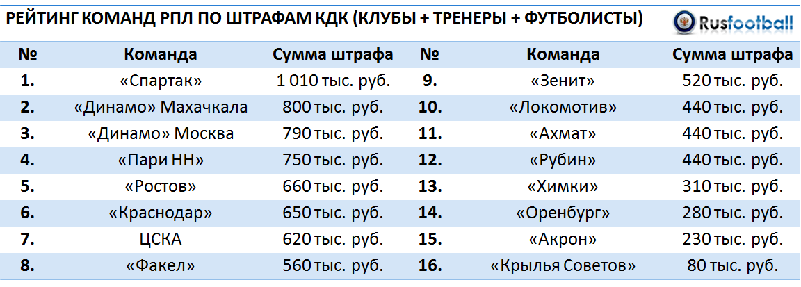Принципиально диспозиция не поменялась – больше всего штрафов заплатил «Спартак», который перевалил за 1 млн, а меньше всего – «Крылья Советов», которые не дотянули и до 100 тыс. руб. Всего РФС получилось «выручить» от клубов РПЛ 8 млн 580 тыс. рублей. При этом штрафы в течение сезона также выписываются командам низших дивизионов и молодежных лиг.