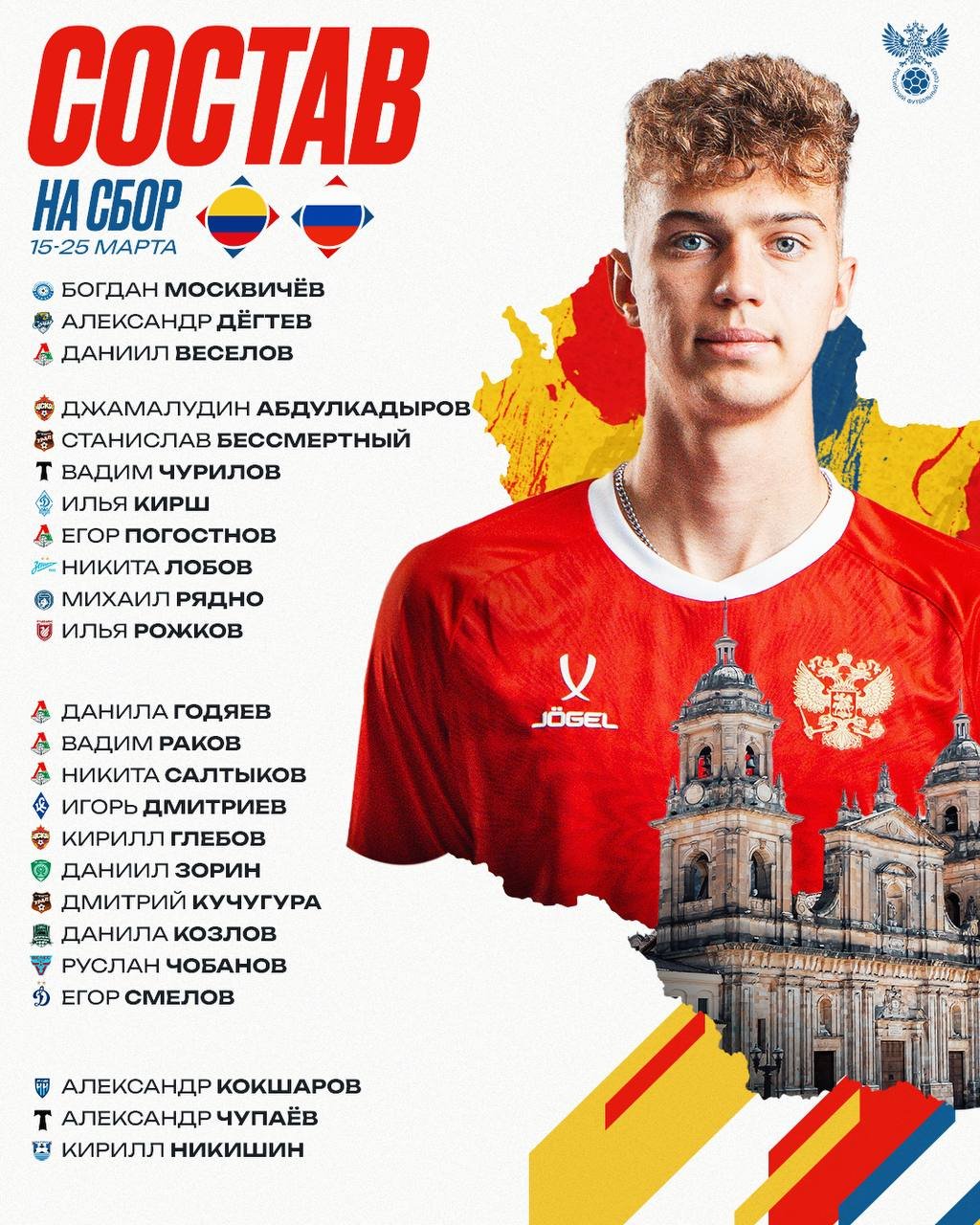 Стал известен окончательный состав молодежной сборной России на сборы в Колумбии.