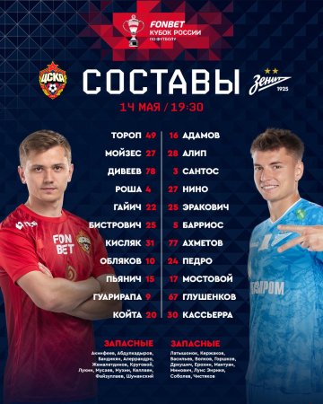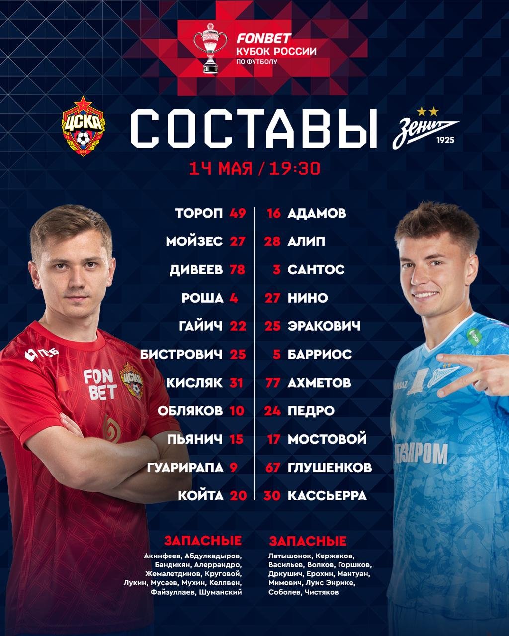 ЦСКА и "Зенит" объявили составы на ответный матч финала Пути РПЛ Кубка России