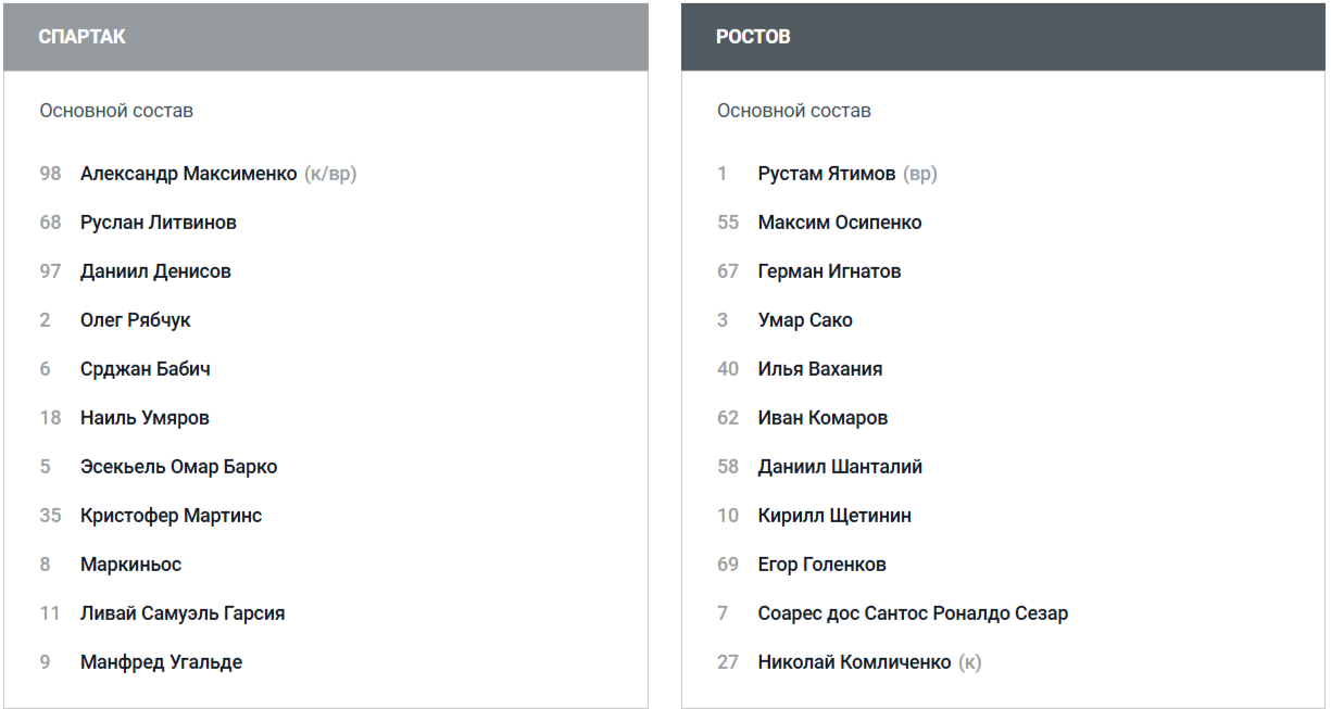 "Спартак" - "Ростов": стартовые составы на финал Пути регионов Кубка России 15 мая 2025 19:15 "Спартак" и "Ростов" объявили составы на финальный матч Пути регионов Кубка России. Фото: РФС Матч начнется в 20:00 на стадионе "Лукойл Арена". Встречу обслужит судейская бригада Кирилла Левникова. Победитель матча сыграет в Суперфинале Кубка России с московским ЦСКА 1 июня. Подписывайтесь на новости футбола от Rusfootball.info в Telegram, Яндекс.Новостях и Гугл.Новостях. Все главные и интересные новости тут Гугл.Новости Яндекс.Новости Телеграм Спартак Ростов