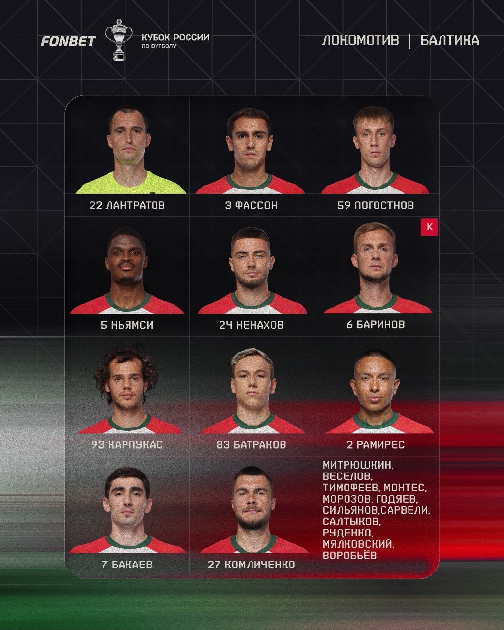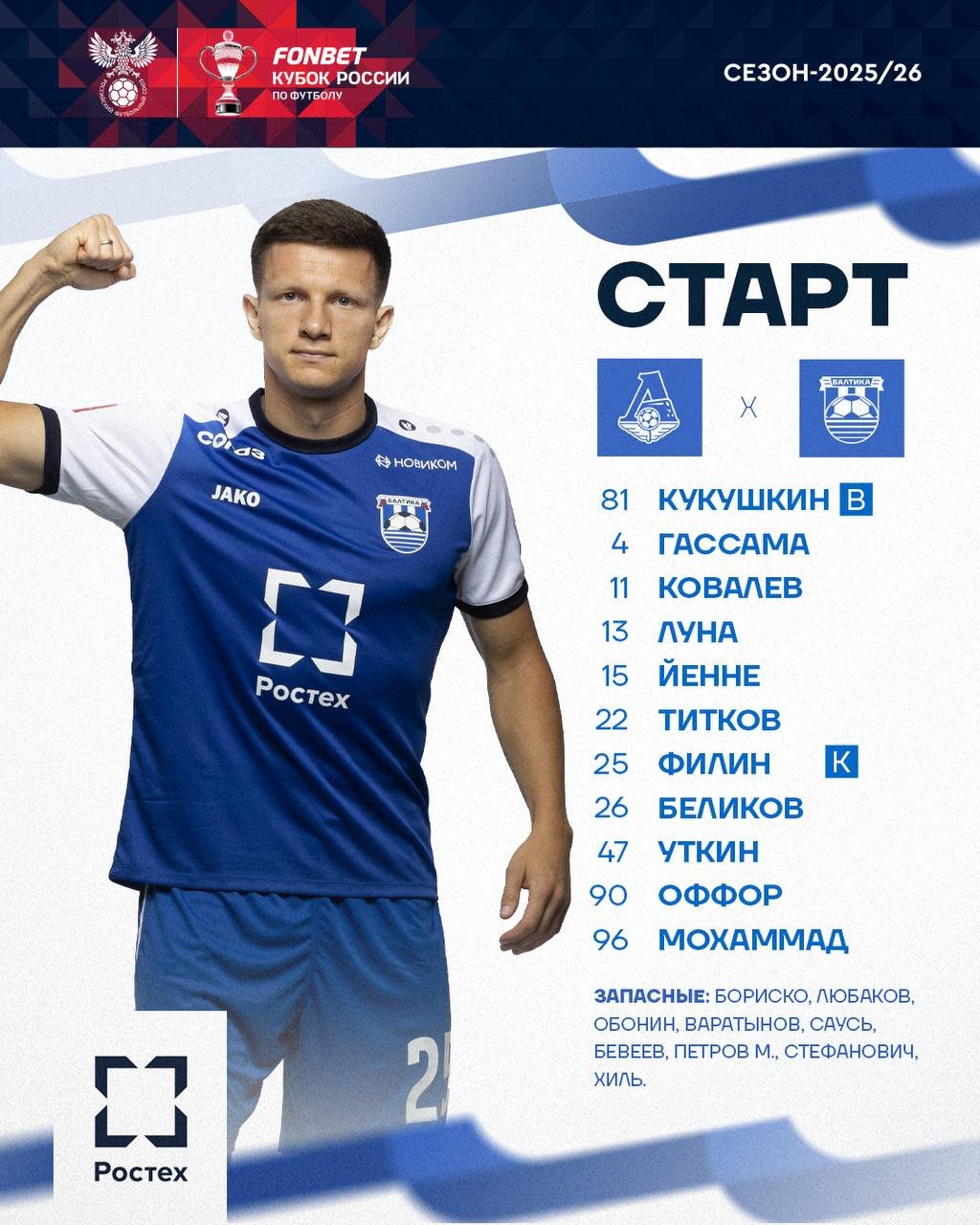 Стали известны стартовые составы "Локомотива" и "Балтики" на 2-й тур Пути РПЛ Кубка России.