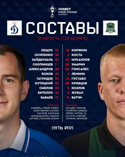 "Динамо" и "Краснодар" объявили составы на игру Пути РПЛ