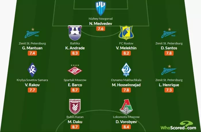 Whoscored представил сборную лучших футболистов минувшего тура чемпионата России.