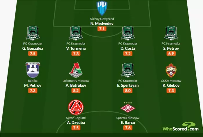 Пять игроков "Краснодара" и хавбек "Балтики" - в символической сборной РПЛ от Whoscored по итогам месяца