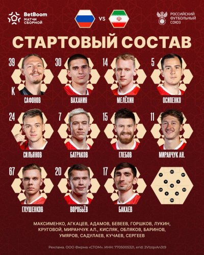 Стал известен стартовый состав российской команды на контрольную игру против сборной Ирана.