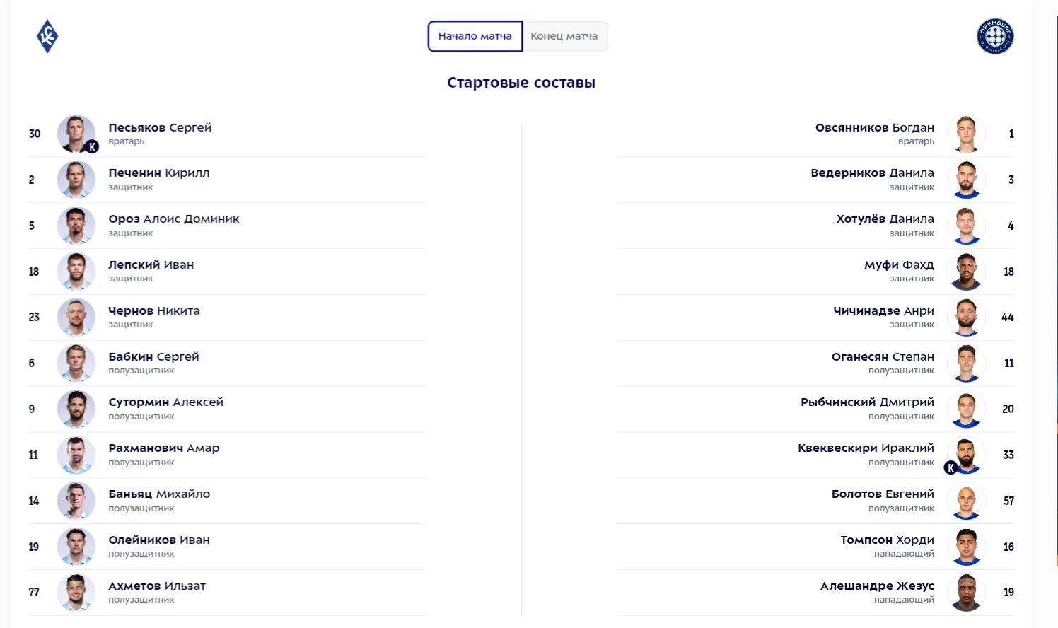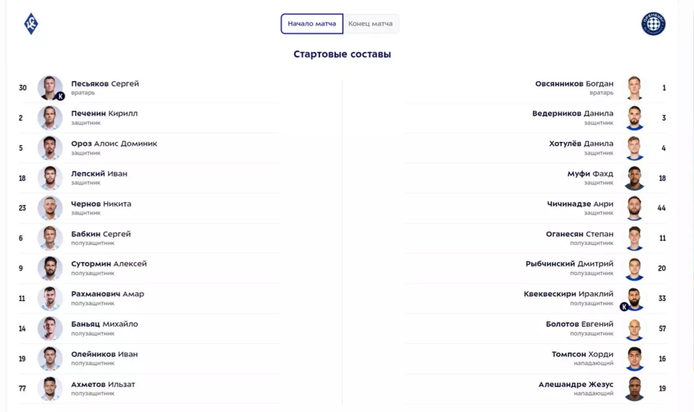 Стали известны стартовые составы "Крыльев Советов" и "Оренбурга" на матч 12-го тура чемпионата России.