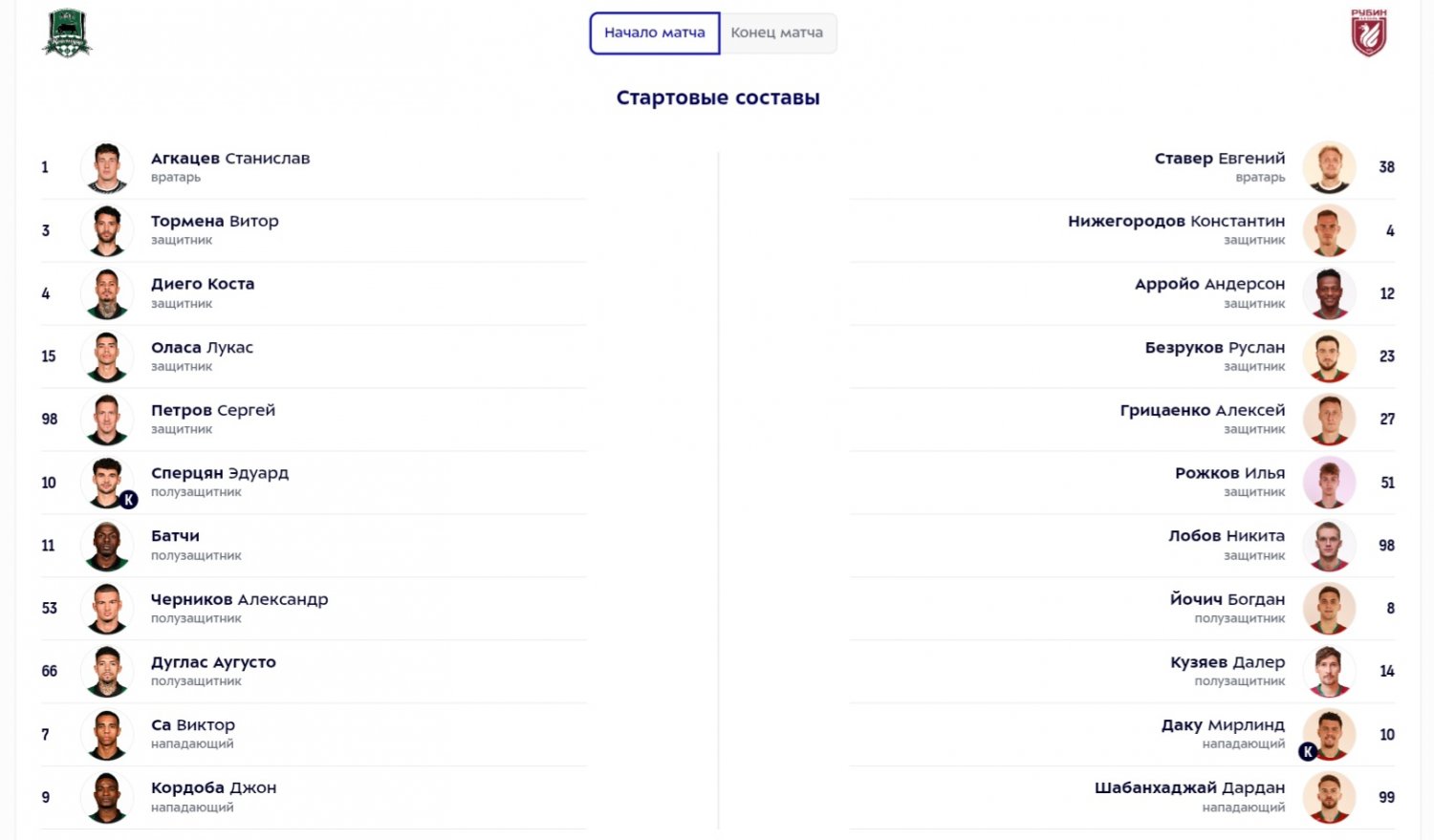 Стали известны стартовые составы "Краснодара" и "Рубина" на матч 13-го тура РПЛ.