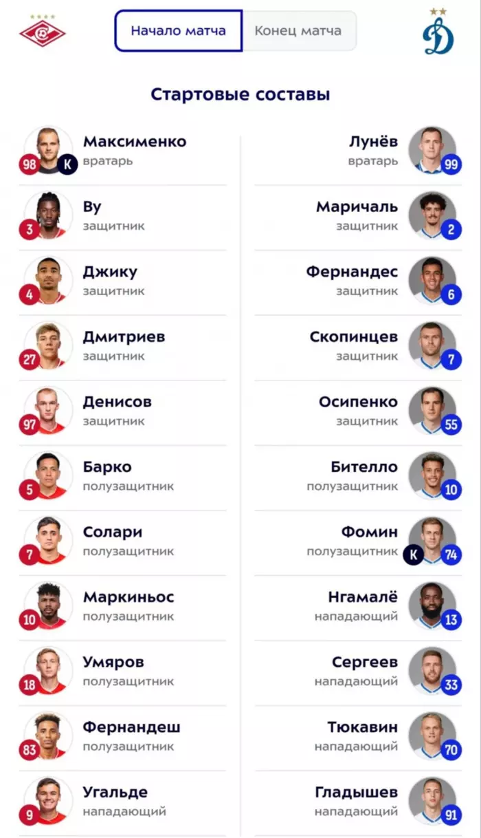 "Динамо" занимает десятое место в турнирной таблице чемпионата России, набрав 20 очков. "Спартак" находится на шестой строчке с 28-ю баллами в своем активе.