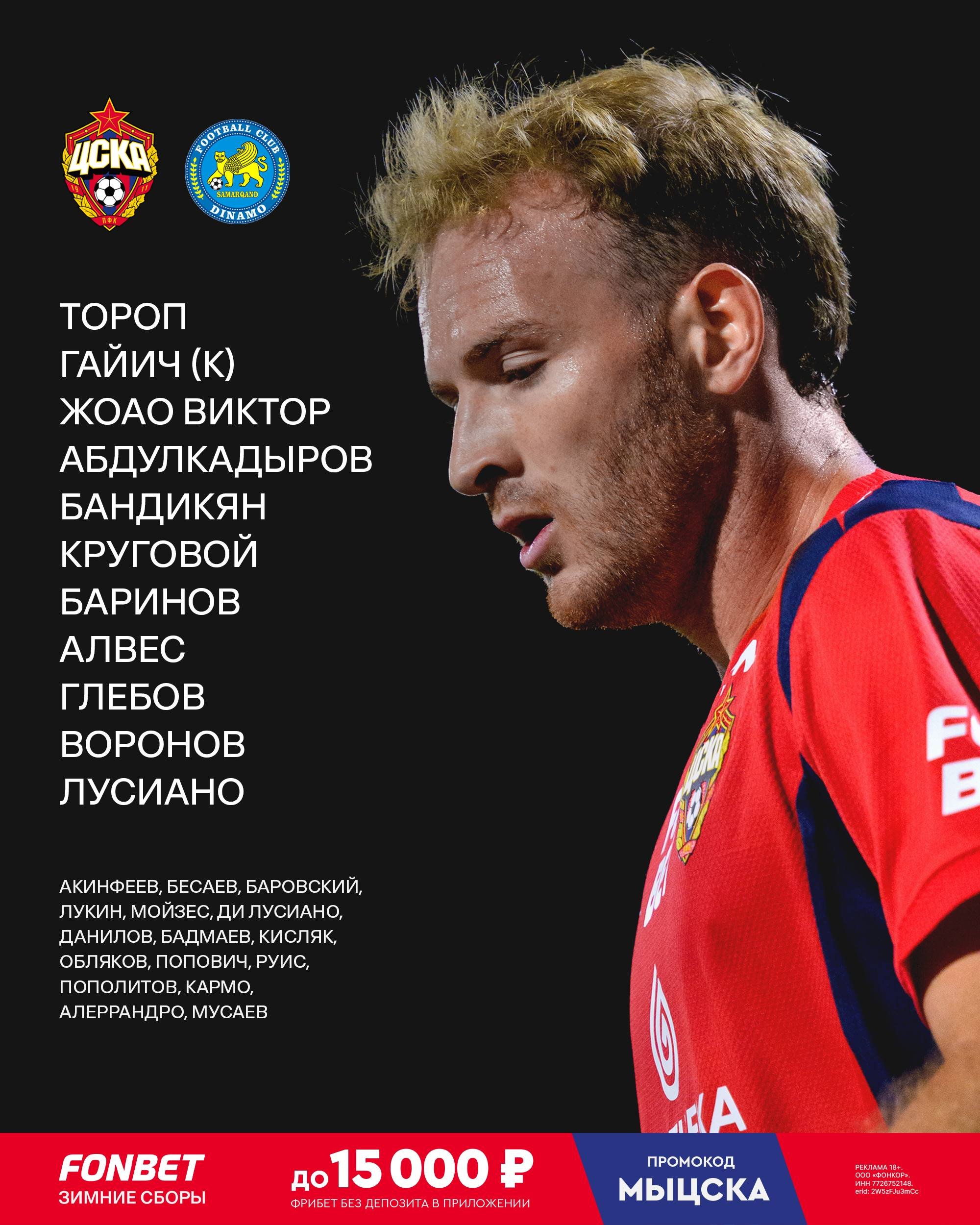 Лусиано и Воронов - в стартовом составе ЦСКА на контрольную игру с "Динамо" Самарканд