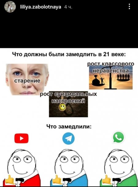 В одной из социальных сетей Лилия опубликовала мем с текстом: "Что должны были замедлить в 21 веке: старение, рост классового неравенства, рост суицидальных настроений. Что замедлили: YouTube, Telegram, WhatsApp".