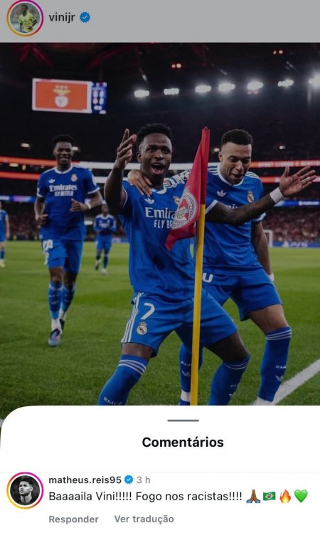 Новичок московского ЦСКА Матеус Рейс поддержал Винисиуса в социальных сетях, написав в комментариях под публикацией фотографии бразильца: "Танцуй, Вини! Жги расистов!".