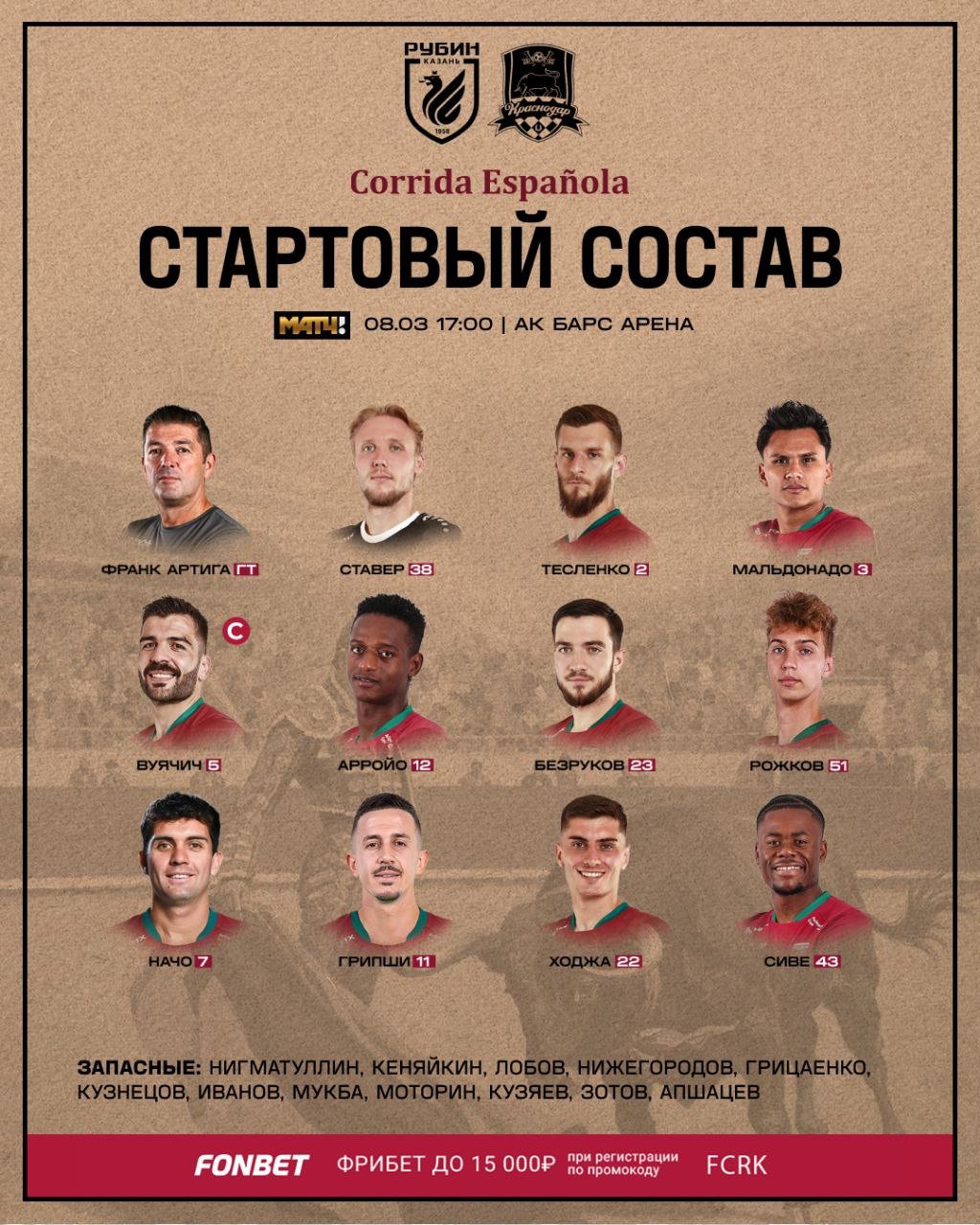 Матч 20-го тура РПЛ между "Рубином и "Краснодаром" состоится сегодня 8 марта. Встреча пройдет на "Ак Барс Арене" в Казани. Начало - в 17:00 по московскому времени.