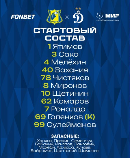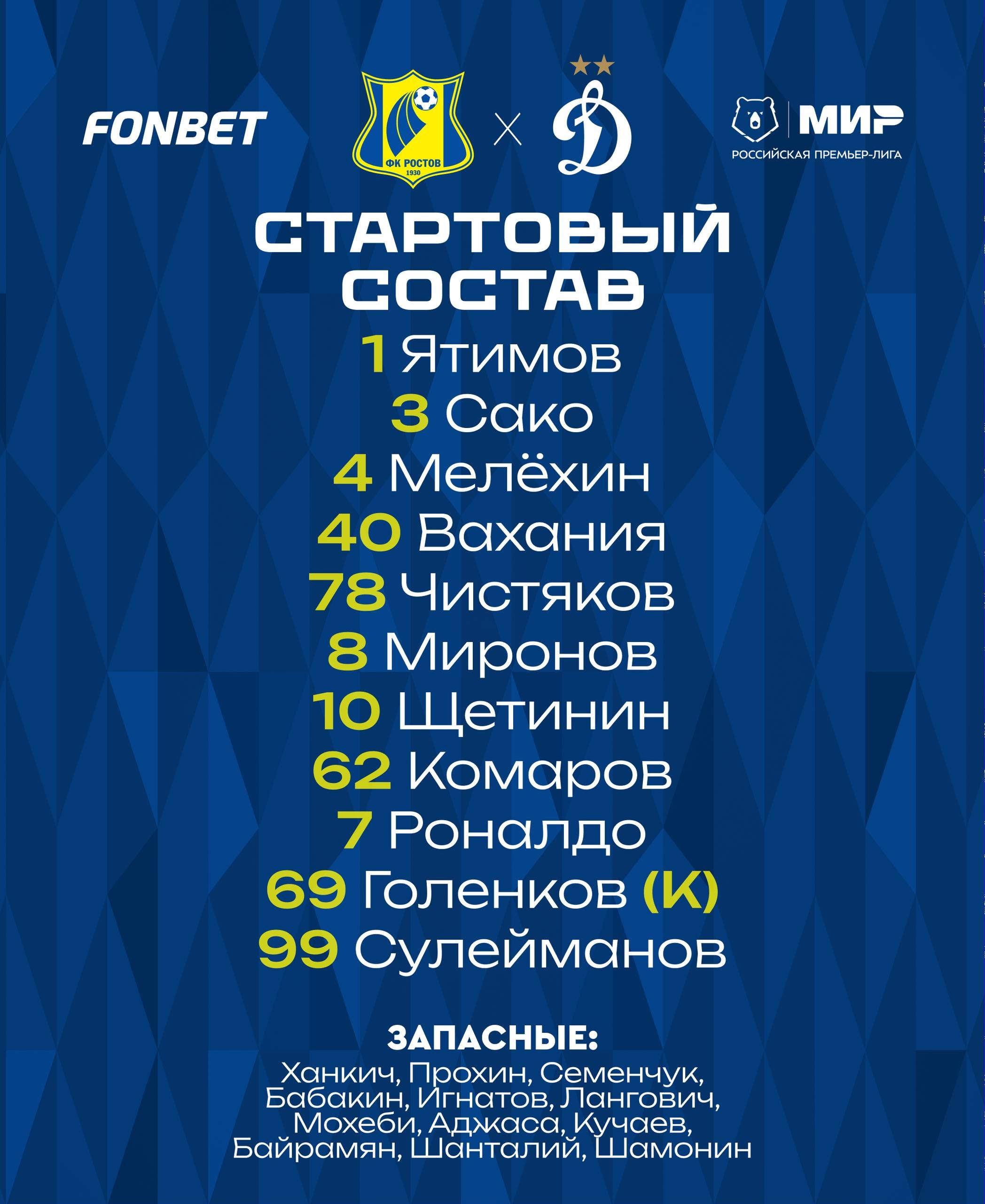 "Ростов" и "Динамо" объявили стартовые составы на матч 21-го тура РПЛ