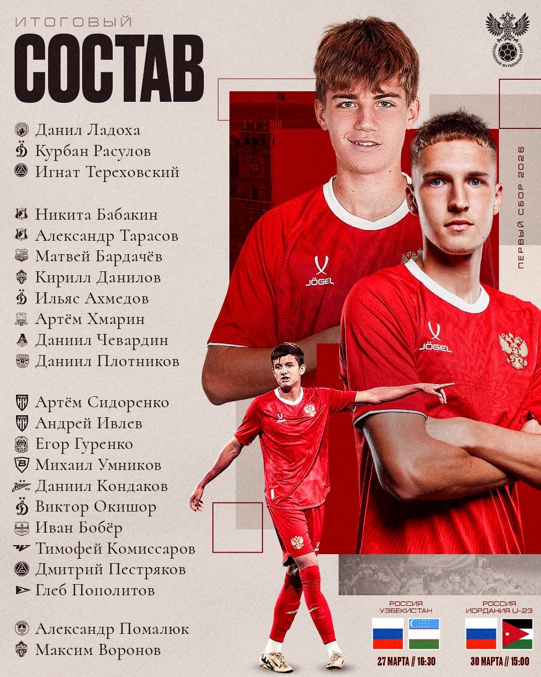 27 марта подопечные Ивана Шабарова встретятся с национальной командой Узбекистана. 30 марта Россия сыграет против сборной Иордании U-23.