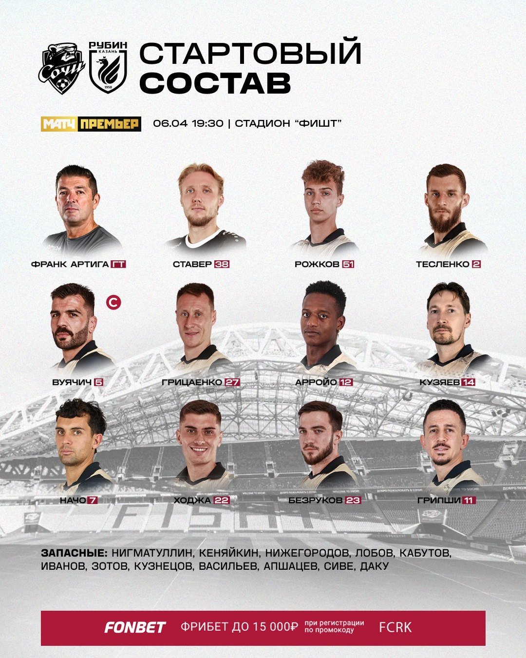 23-й тур РПЛ завершится матчем между "Сочи" и "Рубином". Игра состоится сегодня, 6 апреля, и пройдет на сочинском стадионе "Фишт". Стартовый свисток прозвучит в 19:30 по московскому времени.