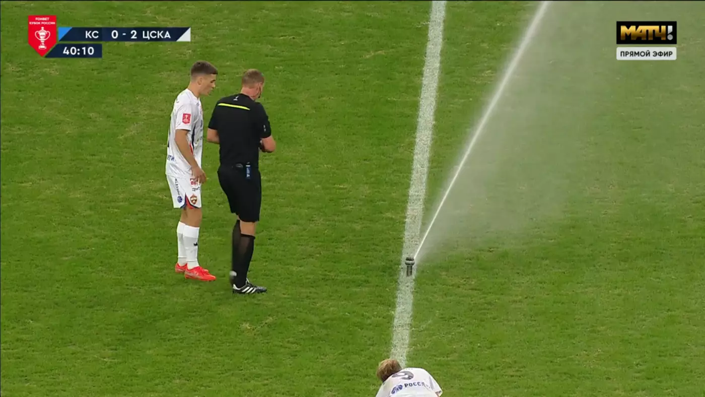 В первом тайме матча полуфинала Пути регионов Кубка России "Крылья Советов" - ЦСКА включился полив газона, главный арбитр остановил игру и через минуту матч возобновился.