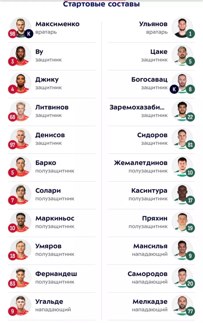 "Спартак" - "Ахмат": стартовые составы на матч 25-го тура РПЛ Сегодня, 15:47 "Спартак" и "Ахмат" объявили стартовые составы на матч 25-го тура РПЛ. Фото: официальный сайт РПЛ Матч начнется в 17:00 по московскому времени на стадионе "Лукойл Арена". Встречу обслужит судейская бригада Рафаэля Шафеева.На данный момент "Спартак" идет шестым с 42 баллами, "Ахмат" занимает девятую строчку с 31 баллом. Подписывайтесь на новости футбола от Rusfootball.info в Telegram, Яндекс.Новостях и Гугл.Новостях. Все главные и интересные новости тут Гугл.Новости Яндекс.Новости Телеграм Спартак Ахмат