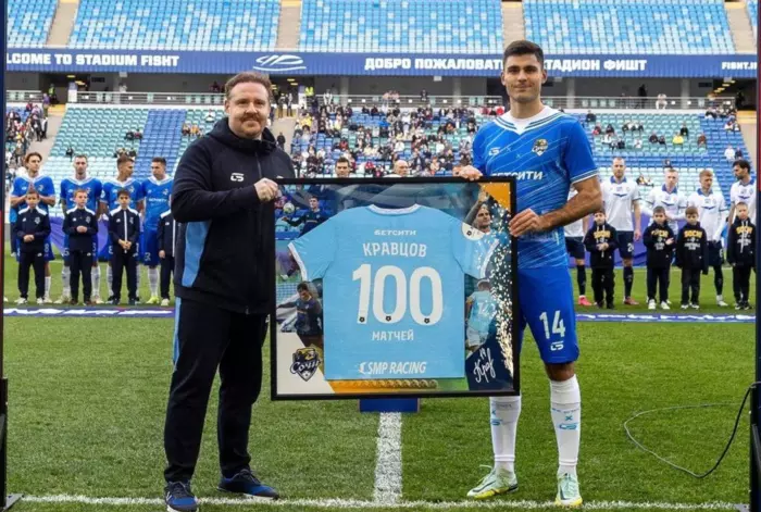 Перед игрой 26-го тура РПЛ с самарскими "Крыльями Советов" (2:1) опорный полузащитник "Сочи" Кирилл Кравцов получил памятный подарок по случаю 100 сыгранных матчей за клуб.