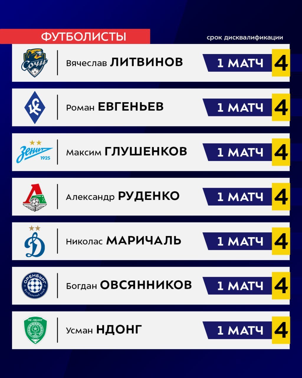 Глушенков, Руденко и Маричаль пропустят 27 тур РПЛ