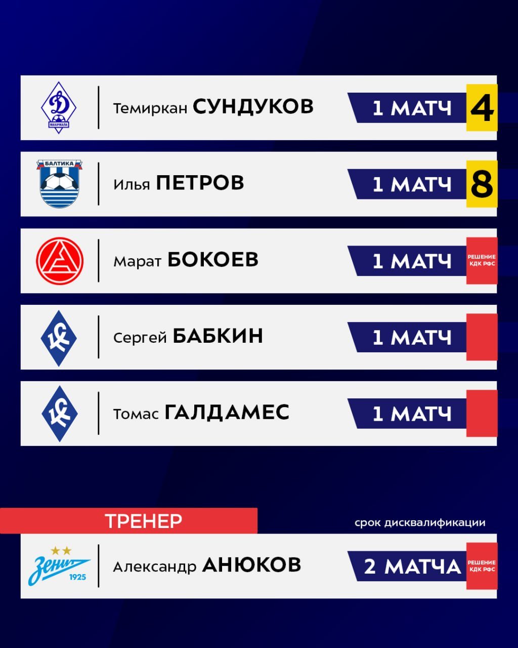 Как сообщает пресс-служба Российской Премьер-Лиги, из-за дисквалификаций ближайший 27-й тур пропустят 12 футболистов и один тренер.