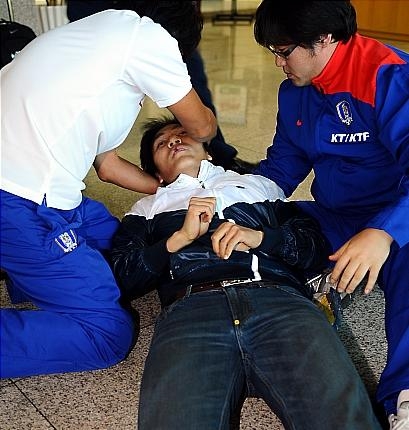 Напомним, что во время летнего вызова в сборную Кореи кореец внезапно потерял сознание в вестибюле гостиницы национальной сборной в результате спазма сосудов головного мозга (на фото). Аналогичные эпизоды имели с ним место и ранее, в том числе, шесть лет назад, на Олимпиаде в Афинах.
