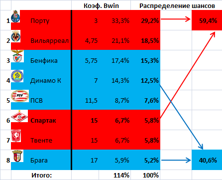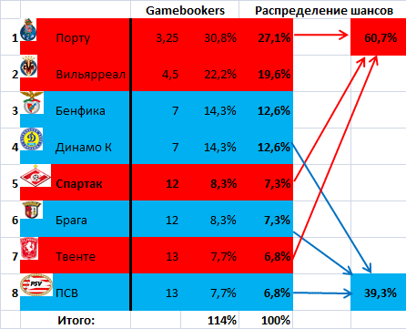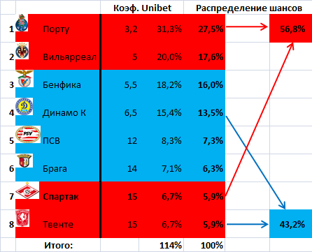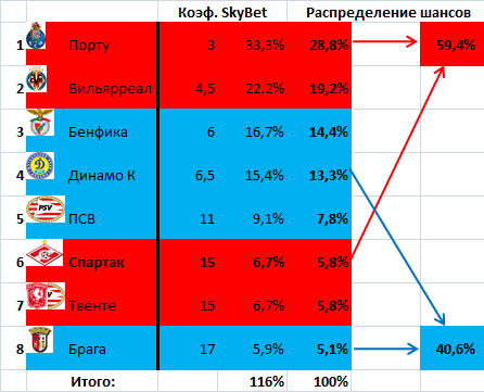 И всё, опять же, из-за неверия в способность «Спартака» одолеть «Порту». Точнее – из-за крепкой веры букмекеров в «Порту». Именно из-за этого «Спартаку» пока что отводится вдвое меньше положенных равновероятностной статистикой 12,5% шансов добраться до финала ЛЕ и победить в нём – 6,2%. Шансы же киевлян сыграть и победить в финале оцениваются даже чуть выше среднестатистических.