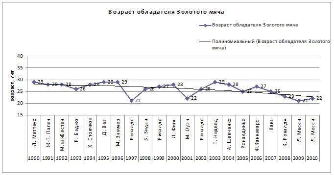 И таким образом видим пик увеличения количества обладателей «Золотого мяча» в возрасте 28лет. В то же время всё таки можно отметить стабильное омоложение победителя.