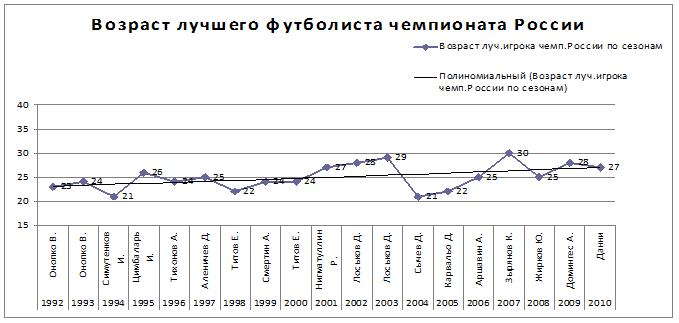 Российская тенденция получилась несколько противоположная мировой. На лицо «взросление» лучшего игрока с 2004 по 2010г. На этот показатель повлиял возраст победителей: К.Зырянова(30лет) «Зенит», А.Домингеса(28лет) «Рубин», М.Данни(27лет) «Зенит». В этом наглядно проявился тот факт, что и «Рубин», и «Зенит» своей стратегической линией сделали ставку на зрелых игроков.