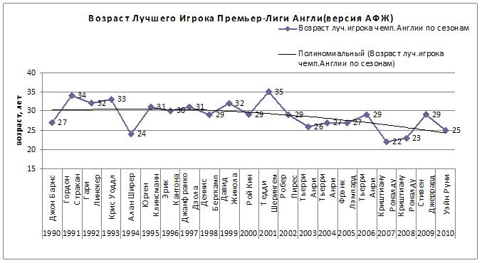 На лицо явная тенденция омоложения, особенно, в последние 4года, на которую несомненно повлияло участие в чемпионате АПЛ К.Роналду, обладателя «Золотого мяча» ФИФА в 2008г. Так же становившегося лучшим по опросу АФЖ в 2007 и 2008гг. в возрасте соответственно 22 и 23года. Так же достаточно молодым победителем в 2010г можно признать У.Руни(25лет) и А.Ширера в 1994(24года).
