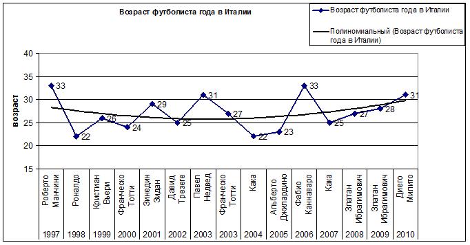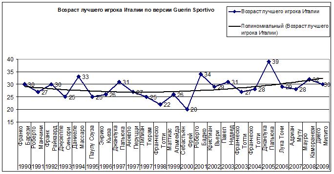 Попробуем проверить нашу версию «старения» лучших игроков итальянской серии А на другой номинации: Футболист года в Италии по версии Guerin Sportivo.