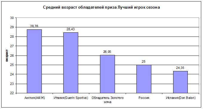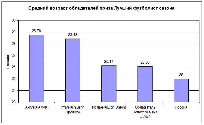 Интересно сравнение тенденций мирового футбола и футбола российского в плане возрастов лучших игроков. В России подобный приз присуждается лучшему игроку чемпионата страны в ПФЛ. Диаграмма по возрасту обладателей данного трофея выглядит след.образом: