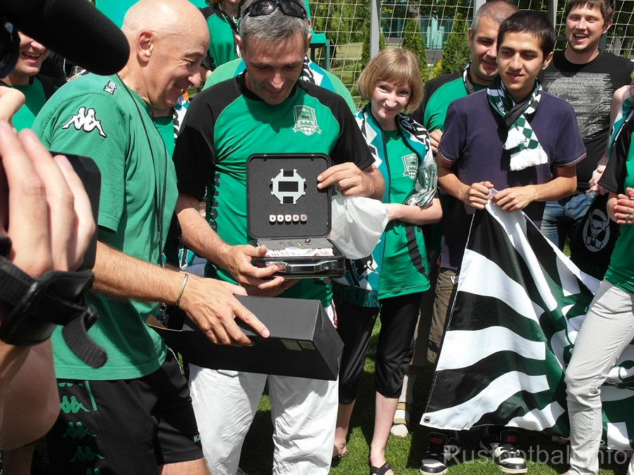 Но вот тренировка закончилась, и теперь болельщики могут пообщаться с игроками. Первым делом они наградили недавних именинников Муслина и Анджелковича.
