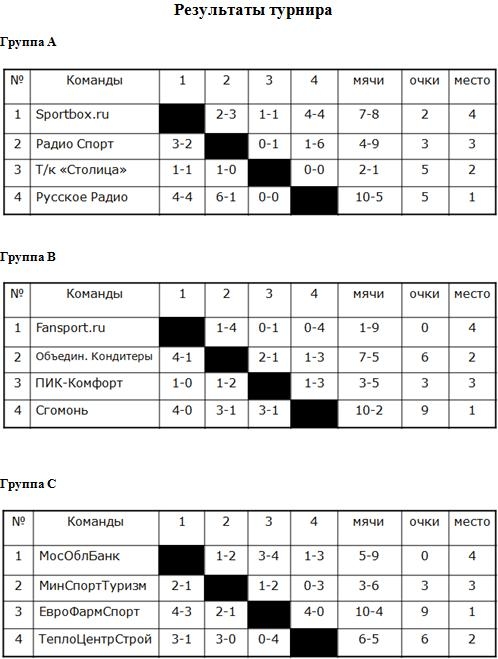 Из подгрупп В и С в четвертьфинал вышли по 3 команды, оставив МосОблБанк и Фан-Спорт за чертой претендентов на главный приз Кубка Торговли.