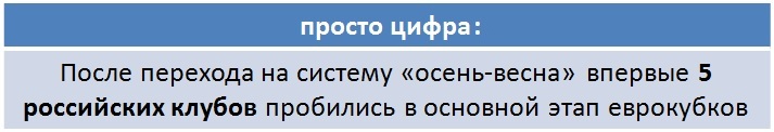 Кстати о еврокубках. Основной причиной перехода на систему «осень-весна» является определение команд, представляющих в следующем еврокубковом сезоне Россию на европейской арене. Раньше в ноябре мы уже определяли те клубы (за исключением победителя кубка России), которые спустя 10 месяцев будут приносить рейтинговые очки в коэффициенте УЕФА. За 10 месяцев команда может потерять главного тренера, лишиться десятка ведущих футболистов или же вообще прекратить свое существование. Сколько раз у нас было, что «Амкар», «Крылья Советов», «Москва», «Динамо» занимали высокие места на конец года, команды показывали интересный футбол, дающий результат, а спустя год это были уже совершенно другие клубы, разобранные и разваленные, замыкающие турнирную таблицу действующего чемпионата.